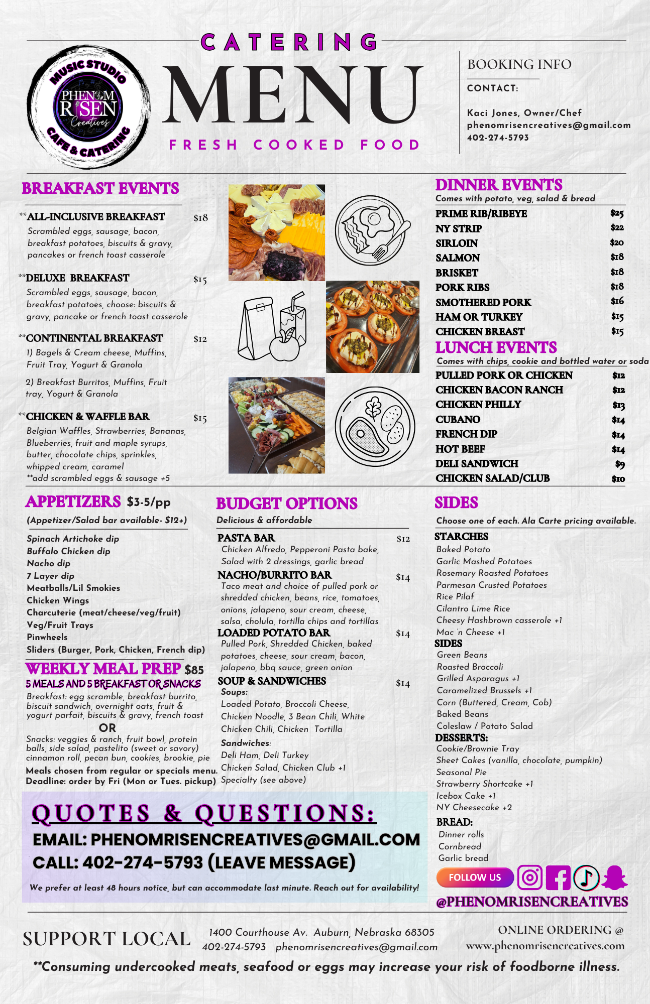 For personalized options from Catering Menu (20% off), email phenomrisencreatives@gmail.comÂ
