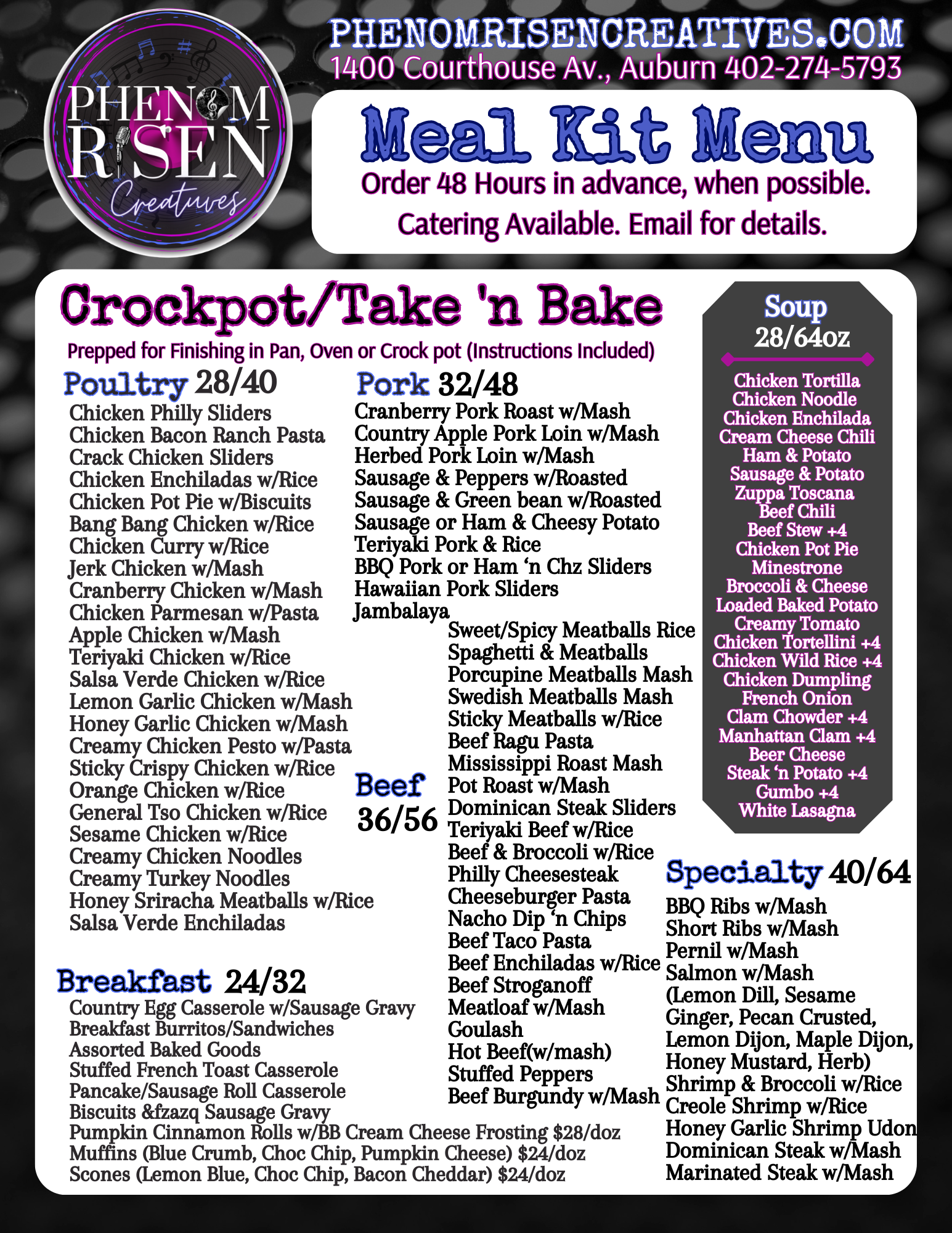 Choose from 5 crockpot meals or 5 casseroles for only $100! Type pork, chicken, turkey, breakfast or soup choices from the menu in the box on the cart screen!
